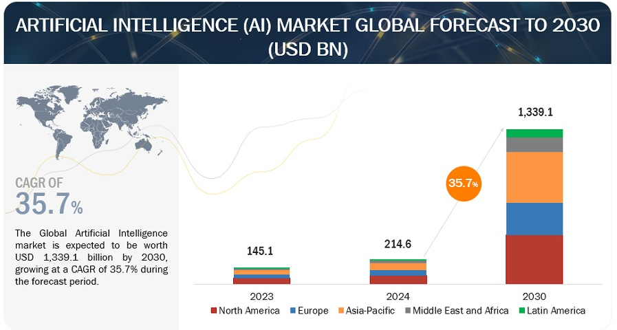 2024年:約2,146億米ドル(約33兆4148億円)2030年:約1兆3,391億米ドル(約208兆5253億円)つまり、世界全体のAIの市場規模は6年間で約5倍に成長すると見込まれていることになります。