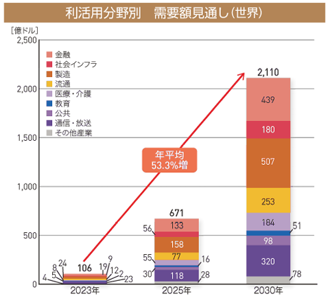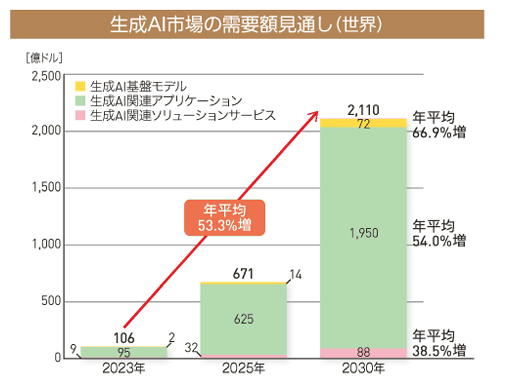 2023年:約106億米ドル(約1兆4840億円)2030年:約2,110億米ドル(約29兆5400億円)つまり、7年間で生成AIに関しては世界全体で20倍近い水準まで成長すると予想されていることになります。