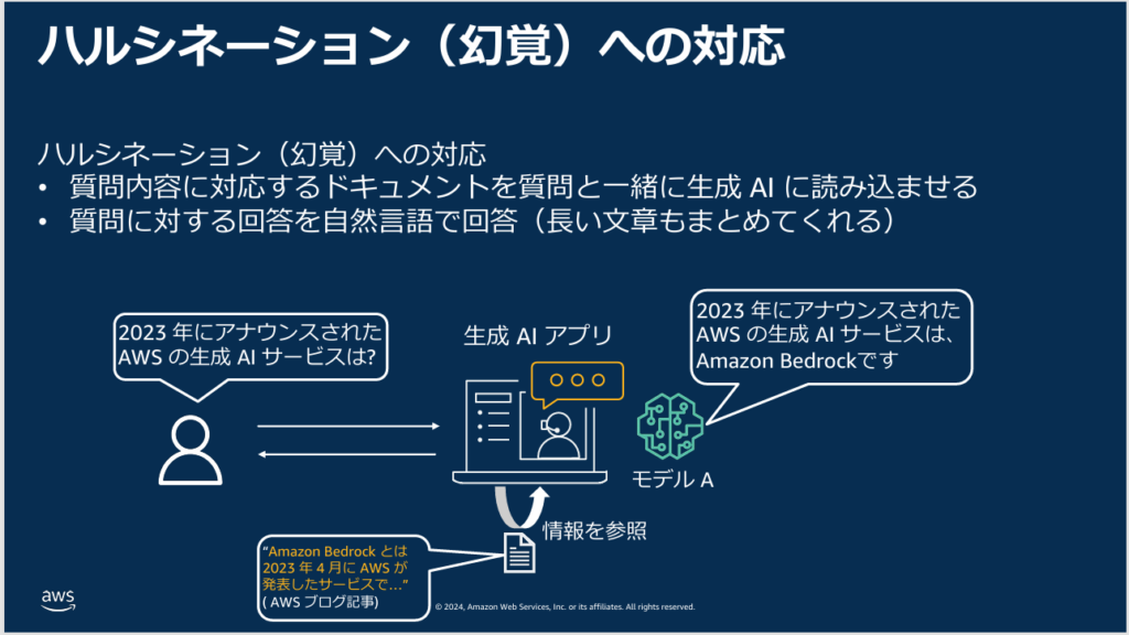 このハルシネーションは基盤モデルの学習した内容に含まれない質問をされているために起こっている事象であることから、その対策としては質問内容に対応するドキュメントを質問と一緒に読み込ませれば良いということになる。