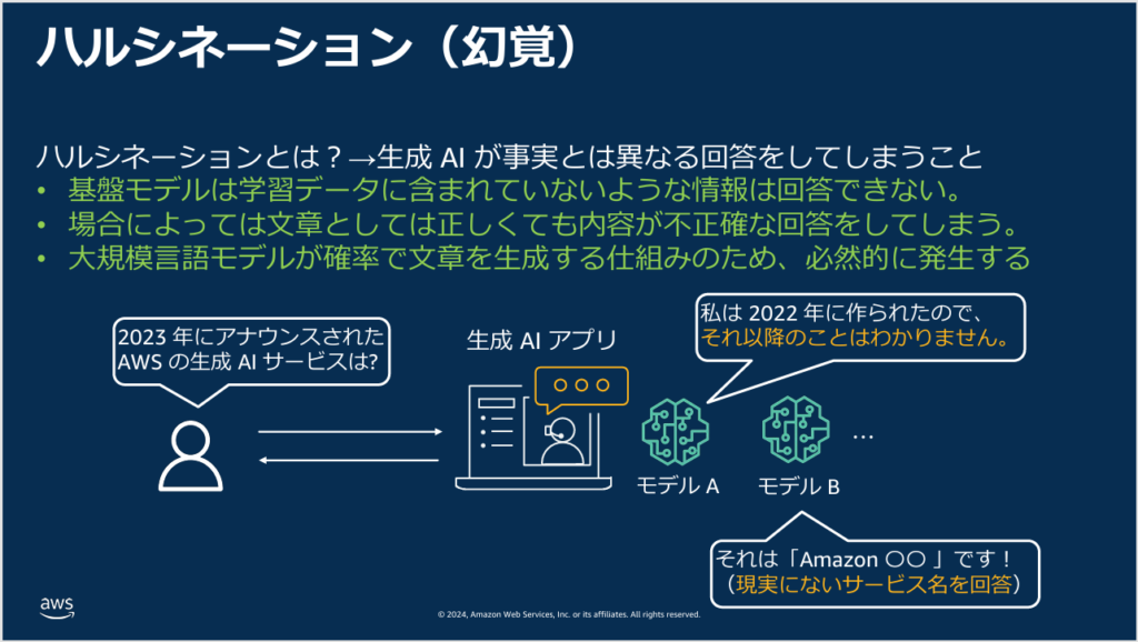 このセミナーの中で紹介されていたハルシネーション(幻覚)とその対応策として便利なRAG(拡張検索生成)について簡単に紹介します。