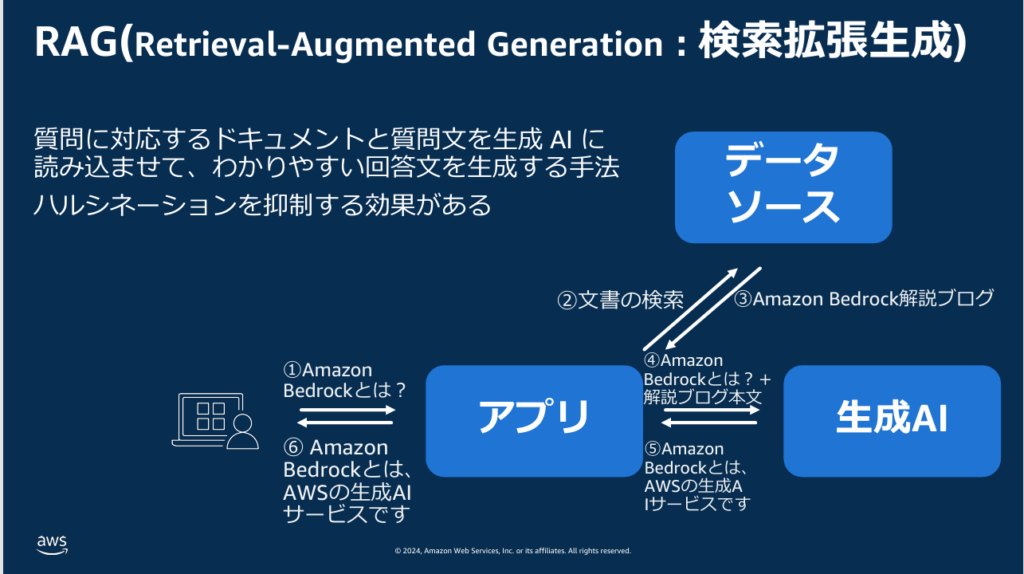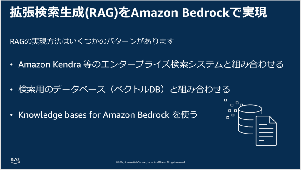 RAGの実現方法はいくつかあるが、AWSではサービスとしてその仕組みが提供されていることが大きい。