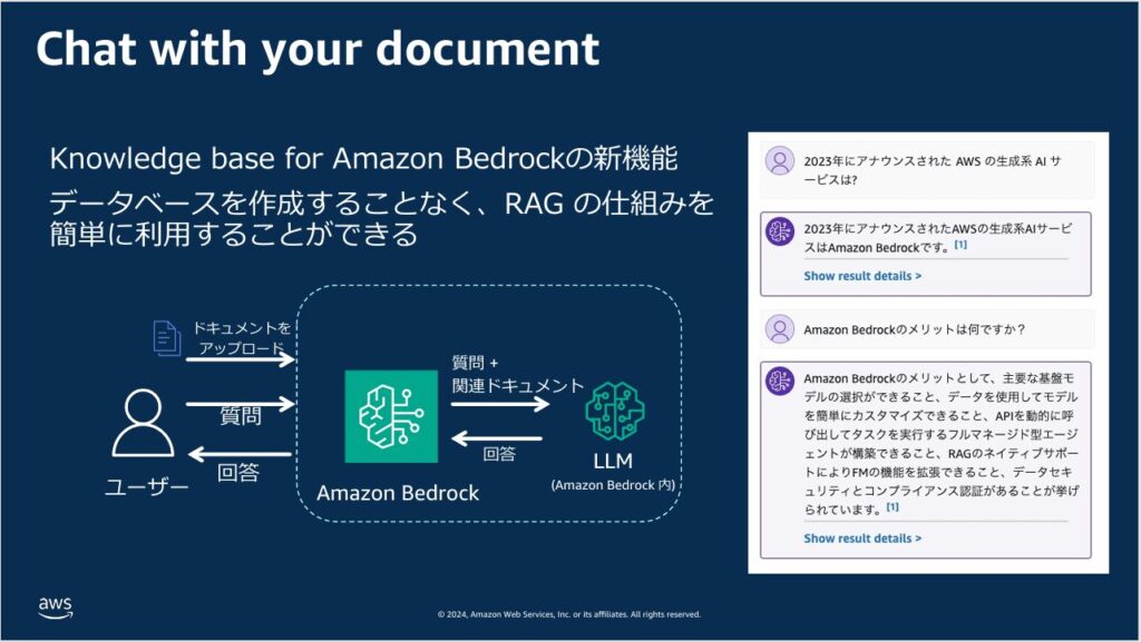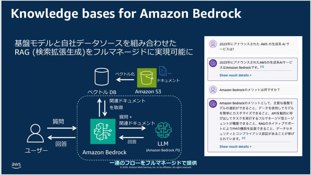 特に大きいのは「Knowledge bases for Amazon Bedrock」を使うことで簡単にRAGをフルマネージドサービスとして利用することが出来る点だろう。