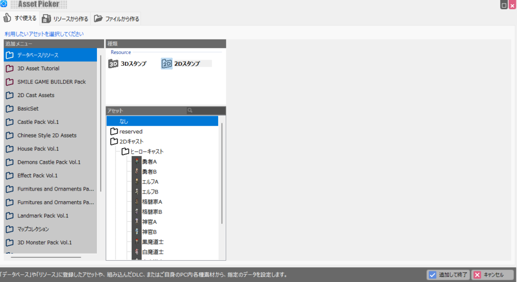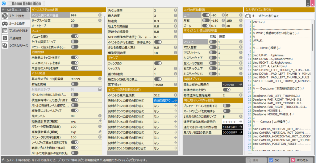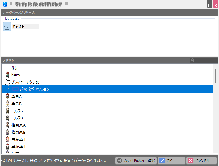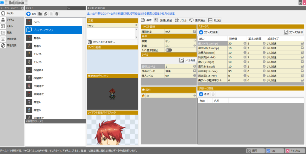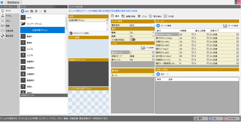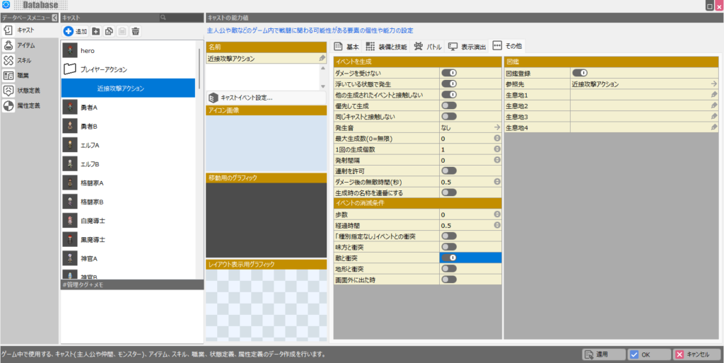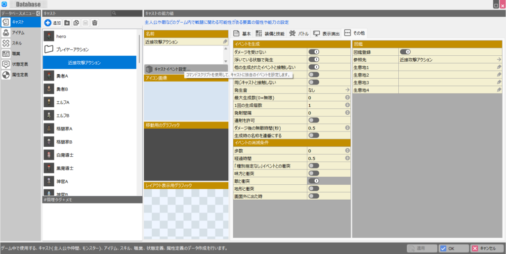 例えば、ゲーム世界に登場する人物である「キャスト」、各効果をもたらす「アイテム」、戦闘等で使用できる「スキル」といったものなどは全て「データベース」で定義します。