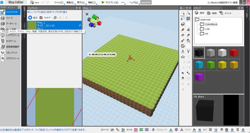 「データベース」では次のようにゲームの世界に登場するモノについて設定が出来ます。