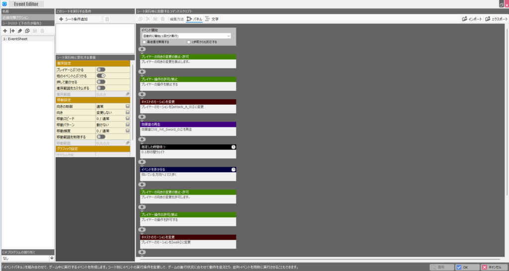 モーション変更は不要な気がしましたが念のため入れています。これが剣を振る攻撃の一連のキャストイベントの流れです。これで完成と言いたいところですが、最後にこのキャストイベントを呼び出すトリガーを設定する必要があります。