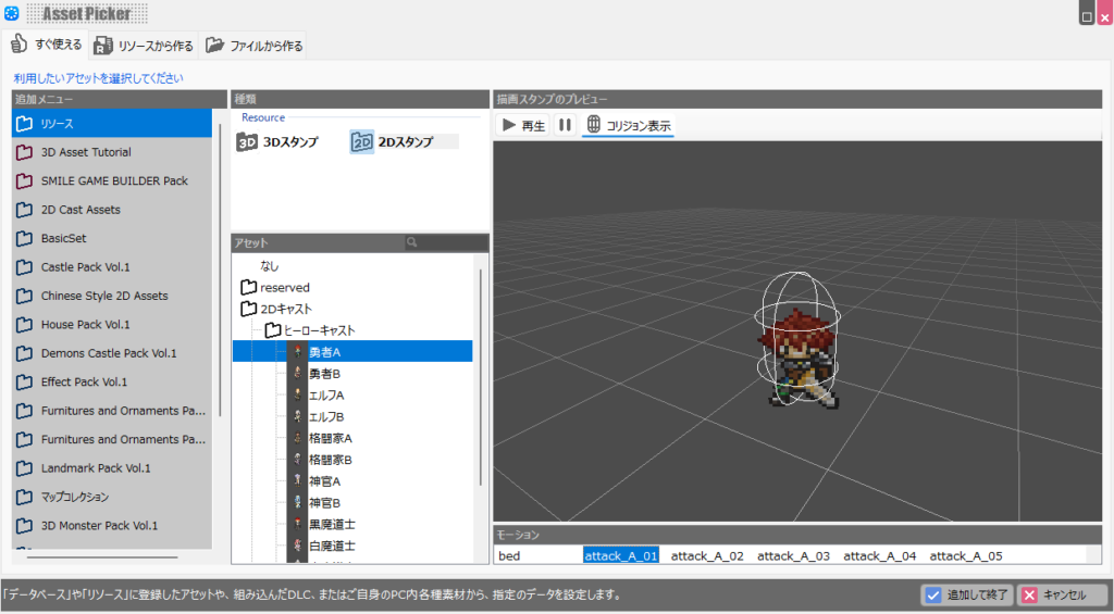 次に「キャストのモーションを変更」で「勇者A」の「attack_A_01」の剣を振るモーションを設定します。これはBakinに最初から入っているモーションなので使わせてもらいましょう。