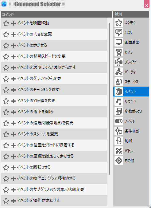 どの種別にどの設定が有るか最初は分からないと思いますが、基本的にはイベント関連の操作を行い時は「イベント」の種別を見る等のやり方で必要なスクリプトは大体は見つかると思います。