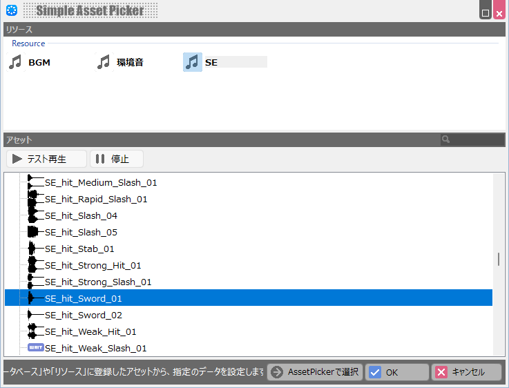 その次に「効果音の再生」で剣を振った時の音を鳴らします。これもBakinに最初から入っている「SE_hit_Sword_01」を設定しておきます。