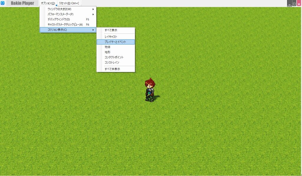 ただ、実際の当たり判定も想定通りになっているかどうか、このままの表示だと分からないと思います。そこで、テストプレイ中の画面の上部にある「オプション」から「コリジョン表示」を選択し、「プレイヤーとイベント」にチェックを入れてみて下さい。