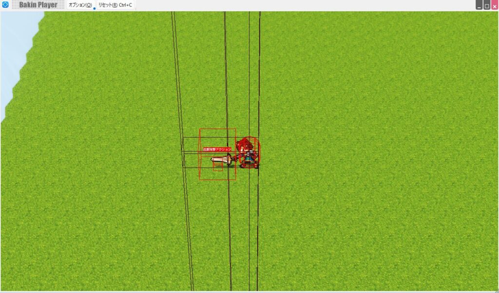 そうすると実際の当たり判定がどうなっているか、赤い線で表示されるようになります。この赤い線で構成された四角形が「近接攻撃アクション」のため、この赤い線に触れた相手にダメージを与えることになります。