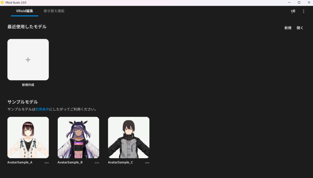 本来であれば「新規作成」を押して、オリジナルの3Dキャラクターの作成をして、それをVRM形式で出力するのが望ましいですが、今回はサンプルモデルを使ってみたいと思います。