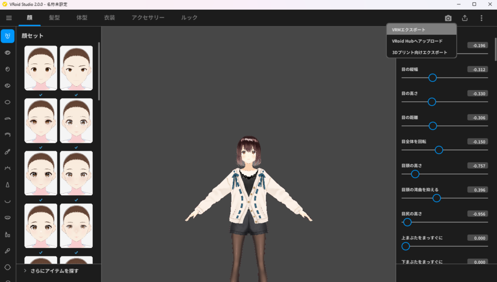 今回はこのモデルのまま利用するので、「VRoid Studio」の右上にある矢印マークをクリックし、出てきた選択肢の中から「VRMエクスポート」を選択して下さい。