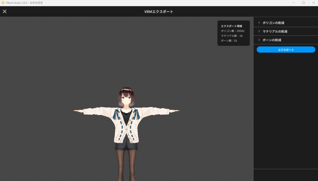 出力したVRMファイルを読み込む先のソフトに合わせて、必要な場合はそれぞれ削減出来るのですが、Bakinで取り込む際はそのまま「エクスポート」を押して問題ありません。