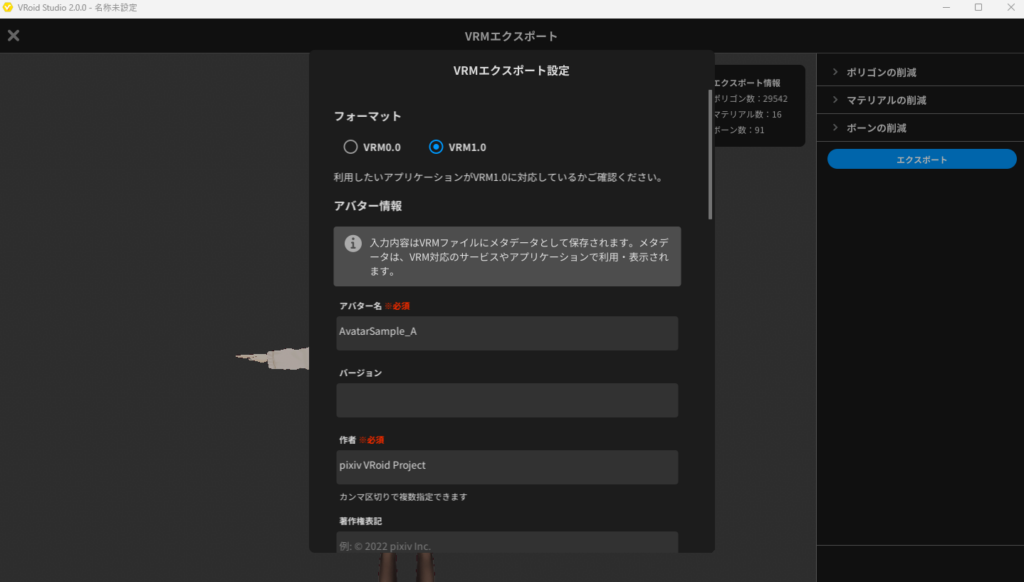 ここでは出力する3Dキャラクターの名前(アバター名)や作者を入力する必要があります。今回はサンプルモデルなのでデフォルトのままとしますが、オリジナルキャラクターの場合は自分でアバター名と作者の名前を決めてください。