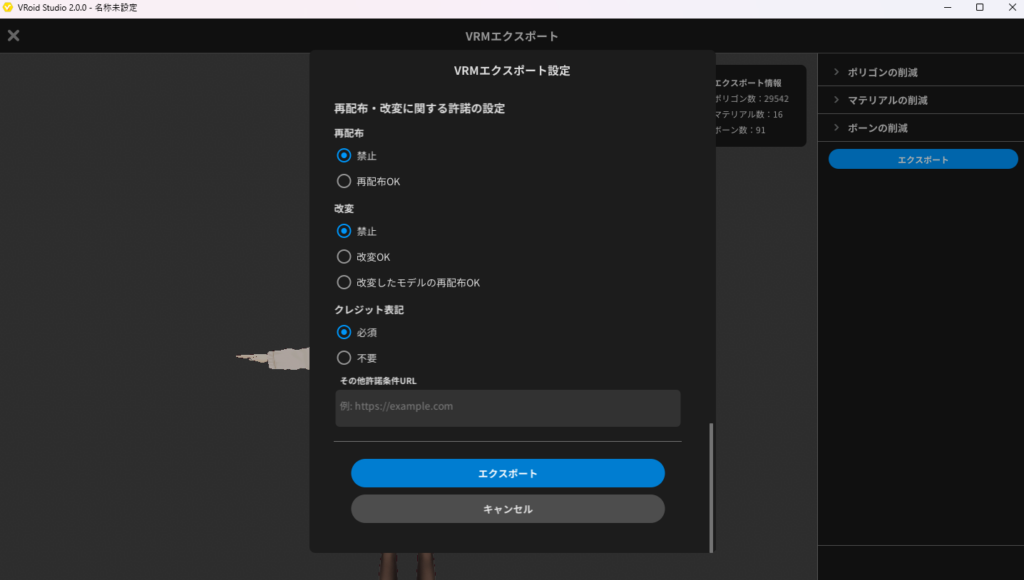 そうすると、次のようなVRMエクスポート画面が表示されます。この画面ではエクスポート前に、3Dキャラクターを構成するポリゴン数やマテリアル数等を削減(劣化)させることが出来ます。