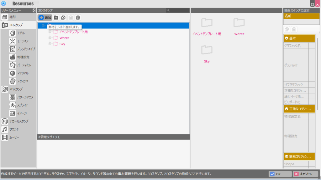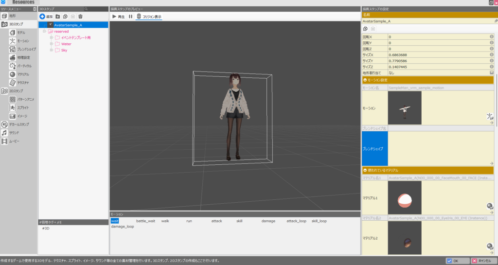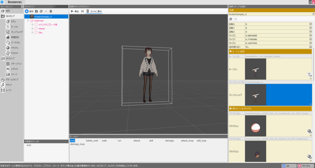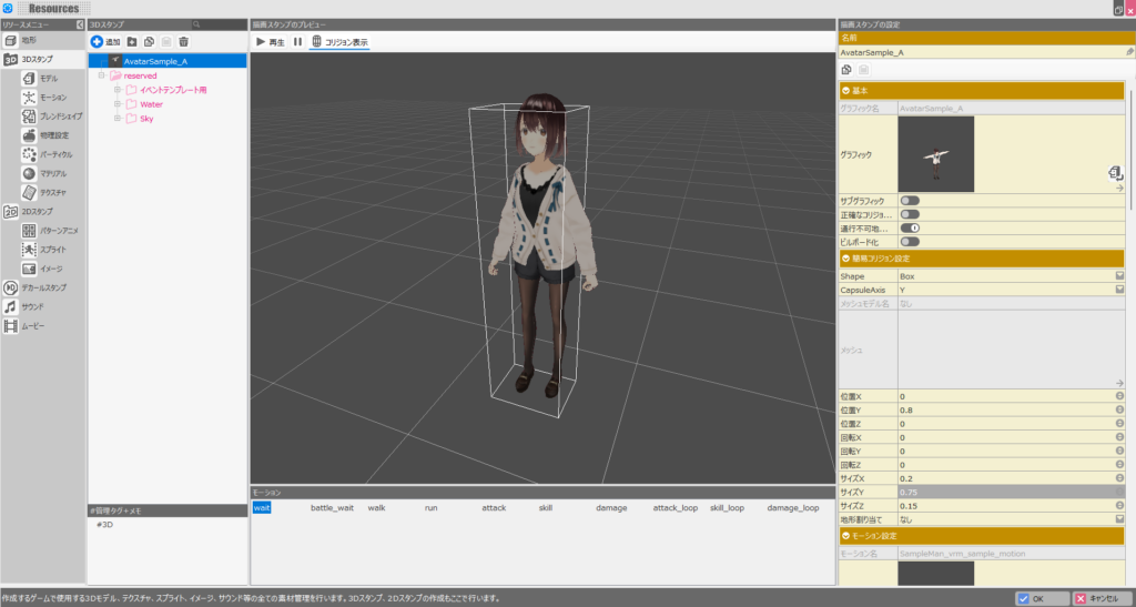 ついでに「当たり判定(コリジョン)」の設定もしておきましょう。3Dスタンプの右側に「簡易コリジョン設定」という項目がありますので、ここの値をモデルに合わせて変更し、白い四角の枠線がキャラクターと同じくらいになるように設定してください。