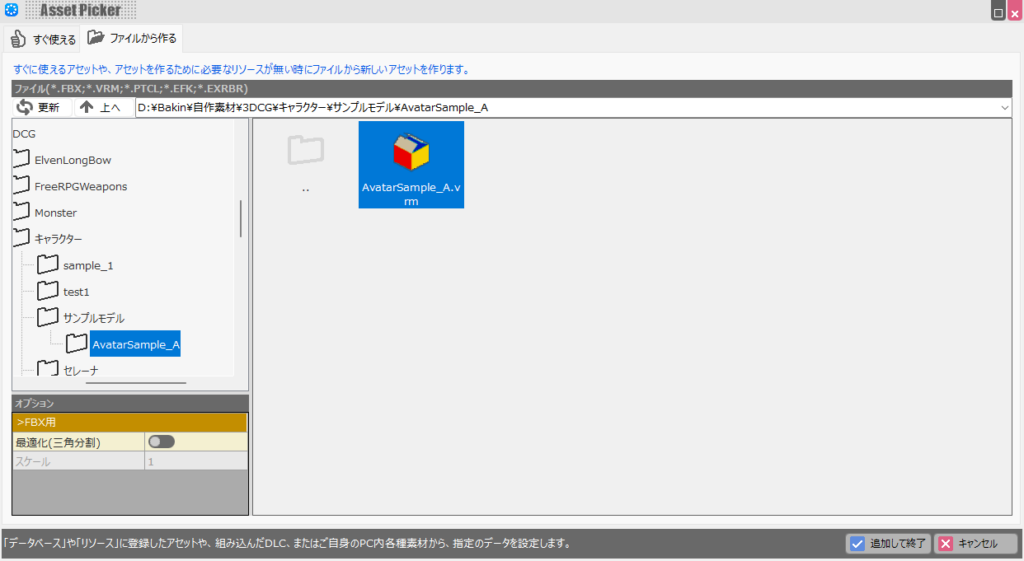 そうすると、追加するファイルを選択する画面が出てくるので、「VRoid Studio」から出力したVRM形式のファイルを選択して、右下にある「追加して終了」を押してください。