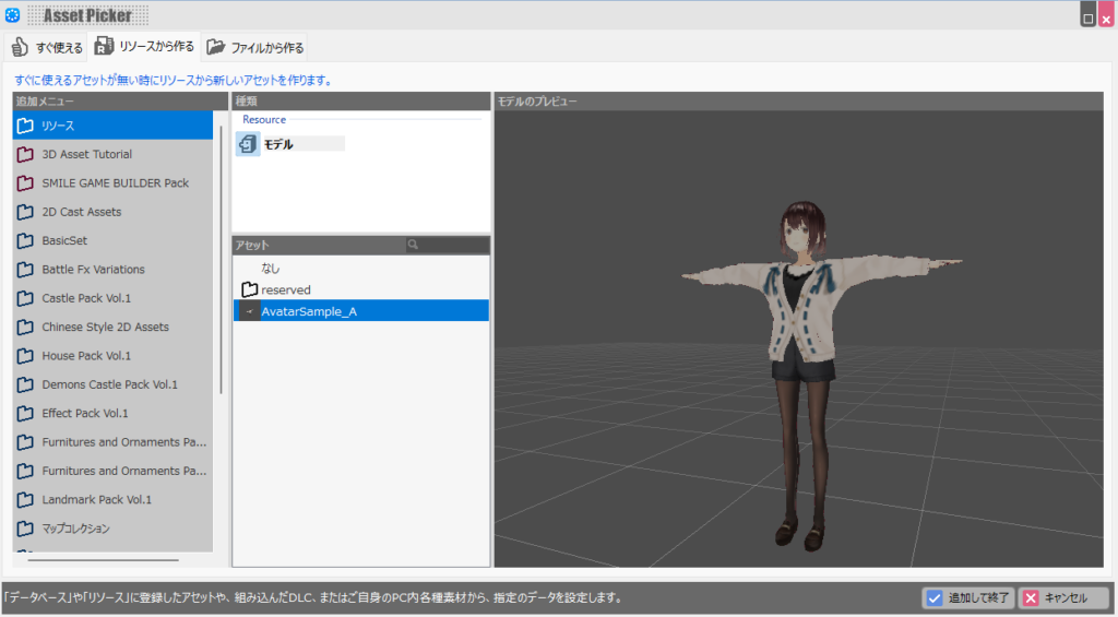 そうすると、ブレンドシェイプを設定する画面が出てきますので、「リソースから作る」を選択して、今回取り込んだ3Dキャラクターのモデルを選択し、右下の「追加して終了」ボタンを押してください。