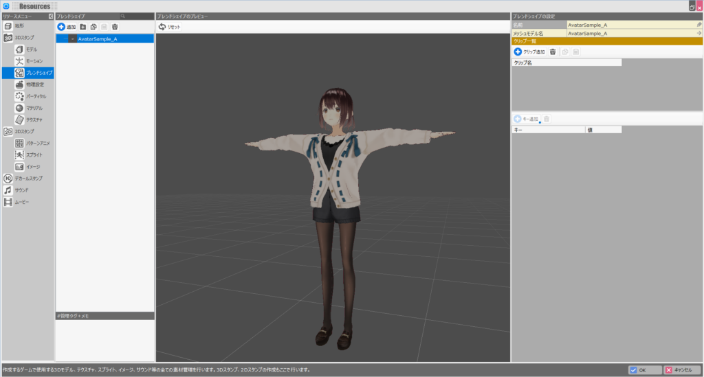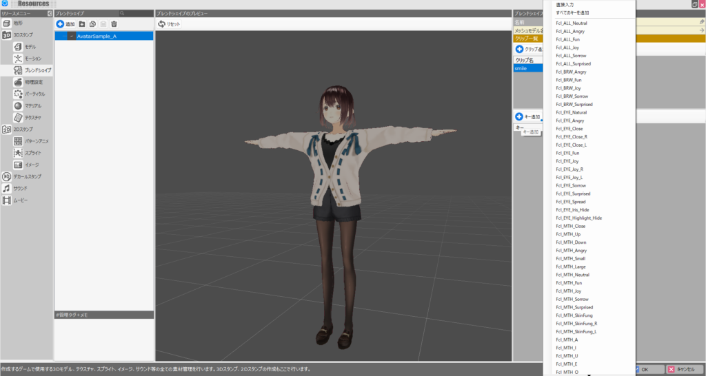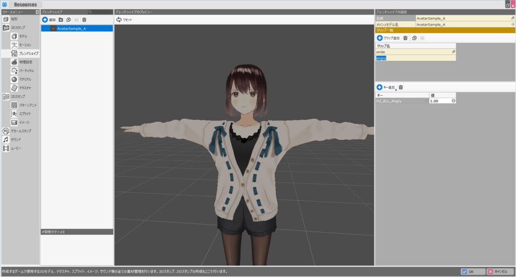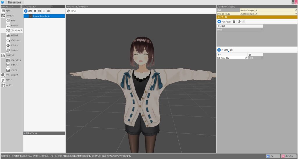 次に画面左側のリソースメニュー欄で「3Dスタンプ」を選択した状態から、「ブレンドシェイプ」を選択した状態に変更します。そうすると、先ほど設定したブレンドシェイプが出来ていると思います。