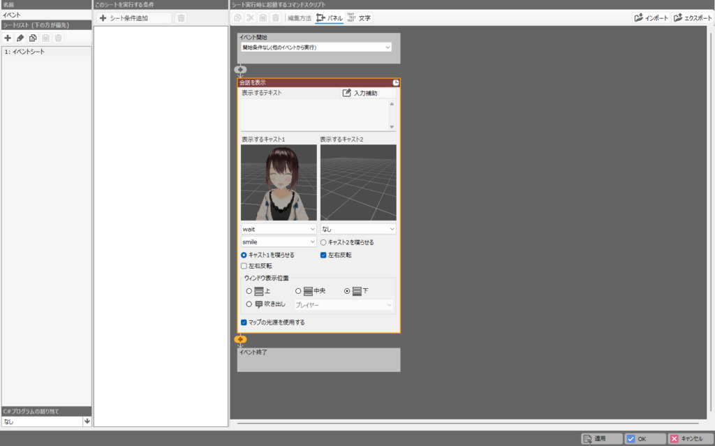 最終的にここで設定した「ブレンドシェイプ」は会話シーンや、イベントからブレンドシェイプの適用といった方法を利用することが出来ます。