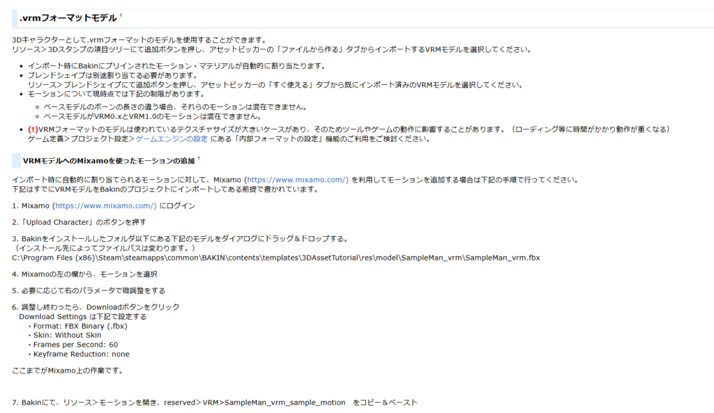 BakinにVRoidを取り込み、モーションを追加する方法については実は公式のWikiにも記載があります。