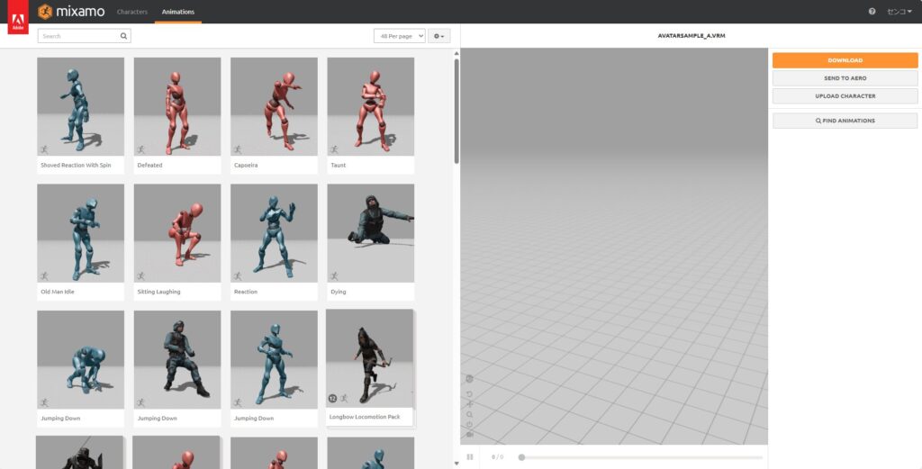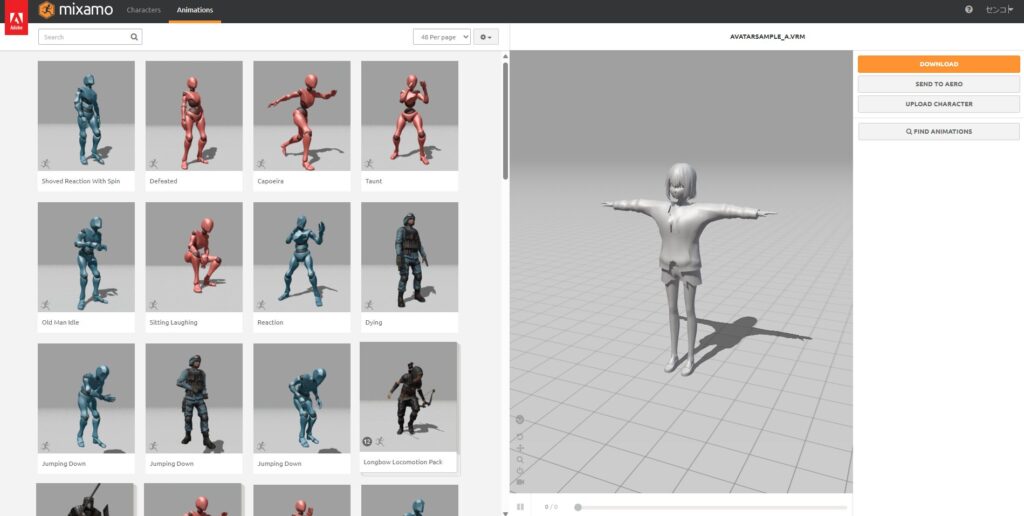 ちなみに「Mixamo」にはもっと可愛いアニメーションや格好いいアニメーションも沢山ありますので、自分の好みに合うものを探してみて下さい。