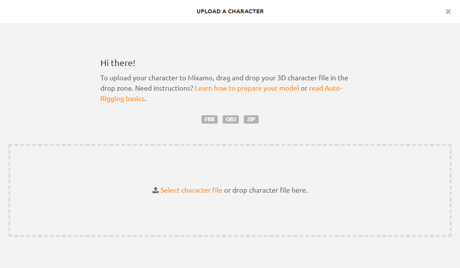 とりあえず、この「VRM名.fbx」の方をドラッグ&ドロップで「Mixamo」のアップロード画面に盛っていきましょう。