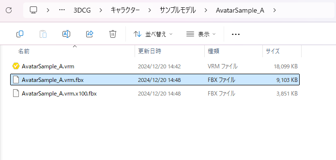 もう一つの「VRM名.x100.fbx」も同様ですが、恐らくこれらはBakinにVRMファイルを取り込む際に裏でFBX形式に変換しているから、途中作成物として残されているのだと思います。