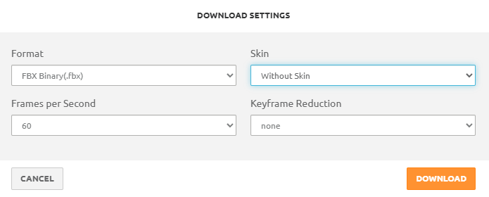 Format : FBX Binary(.fbx)Skin : Without SkinFrames per Second : 60Keyframe Reduction : none問題なければ、そのまま「DOWNLOAD」ボタンを押せば、PC内にFBXファイルとしてダウンロードできます。
