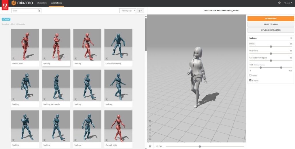 このように「Mixamo」はゼロから自分の好きなアニメーションを生成するのではなく、あらかじめ用意されたアニメーションのテンプレートに沿って、キャラクターを動かすことが出来るのです。