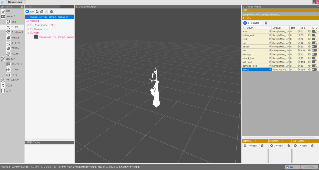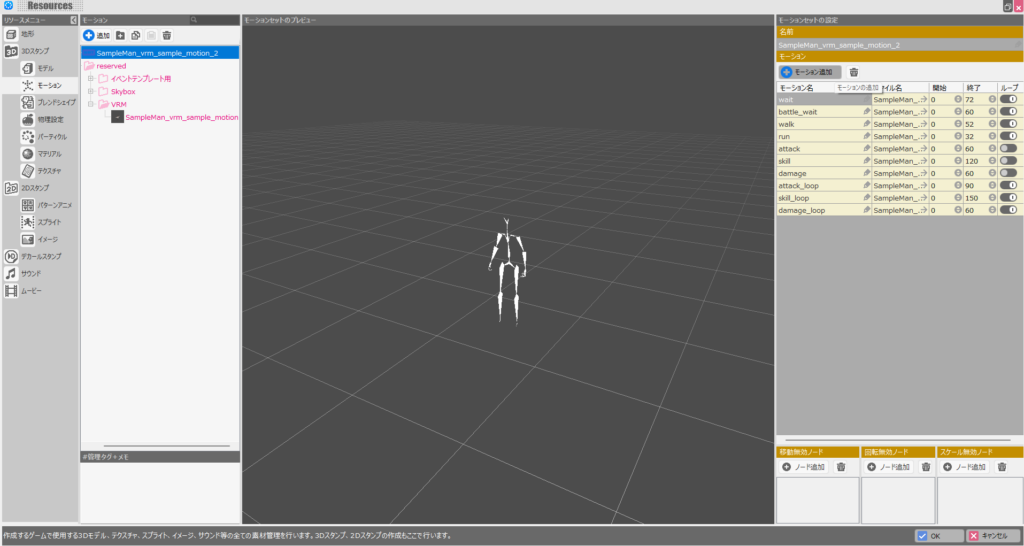 ただし、BakinにVRoidを取り込むだけでは、取り込んだ3Dキャラクターを動かすモーションがデフォルト分しかないため、ゲームで活用するのは少し難しいです。