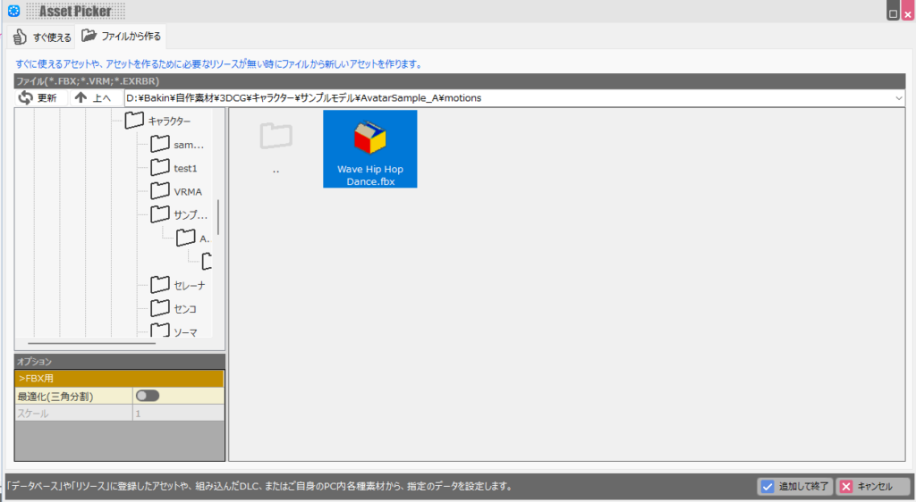 そして、出てきた画面で「Mixamo」からダウンロードしたFBXを選択して、「追加して終了」を押してください。
