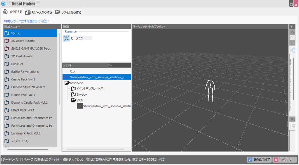 モーション欄をクリックすると、どのモーションにするかを選択する画面が表示されます。そこで、自分で作成した「SampleMan_vrm_sample_motion_2」を選択して、「追加して終了」を押してください。
