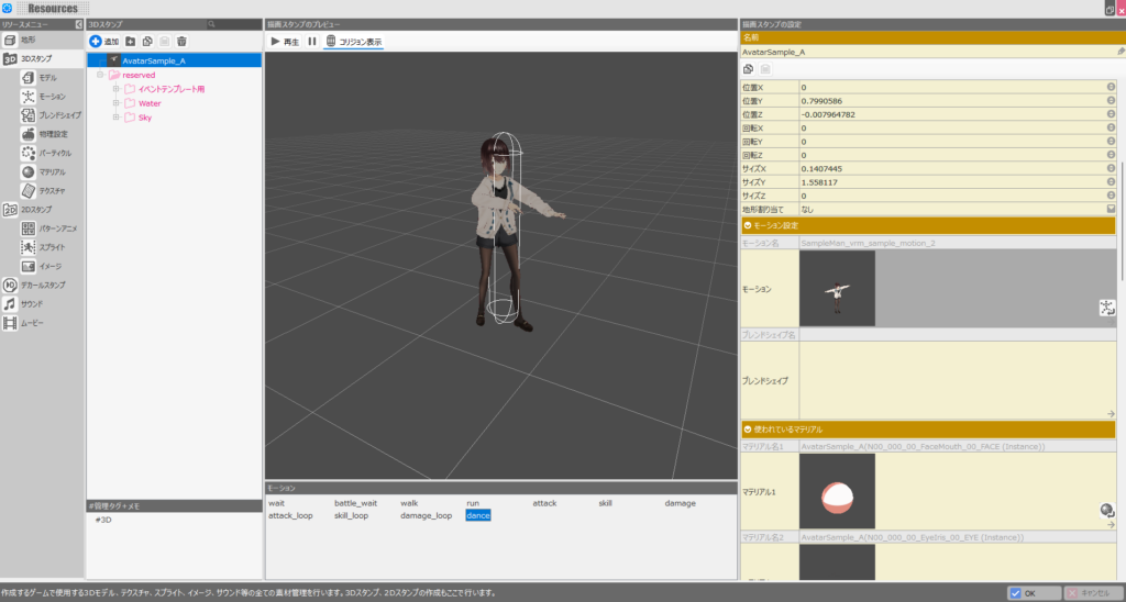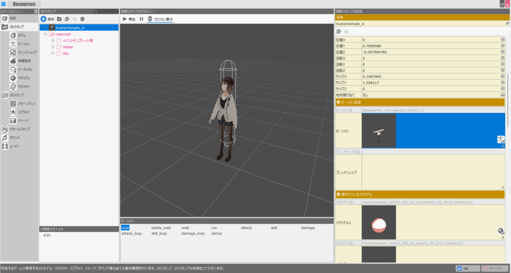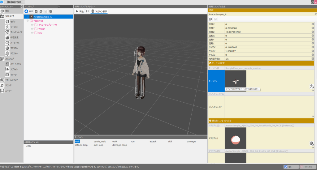 他にも「run」であれば走るモーションとして使用されたり、「wait」は待機モーションとして自動で使用されます。