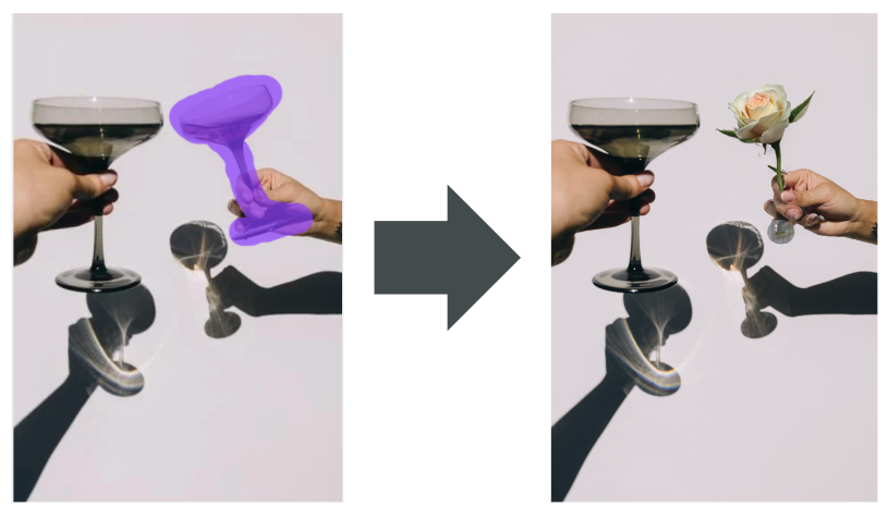 例えば、ワインで乾杯している画像の片側をバラを持っているように変換を掛けると以下のようになります。