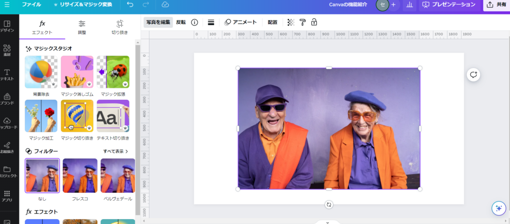 具体的には画像編集に使えるAI機能はCanvaの編集画面で画像を選択した際に上部に出てくる「写真を編集」を押下した際の機能である「マジックスタジオ」というものです。