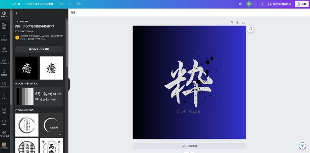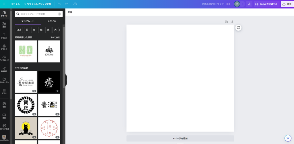 あとはここに作りたいロゴを書いていくだけですが、ゼロから自分でロゴを作るのは難しいと思いますので、こういう時はテンプレートを使いましょう。