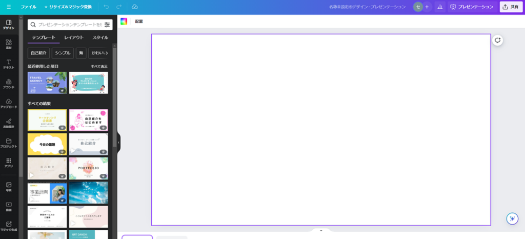 ですが、Canvaにも同じようにプレゼンテーションを行うための機能が搭載されており、個人的には「Power Point」とよりもオシャレなプレゼンを行うことが出来ると考えています。