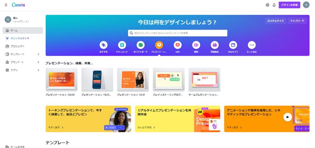 プレゼンテーション用のキャンバスを使うためには、Canvaのホーム画面から「プレゼンテーション(16:9)を選択して下さい。