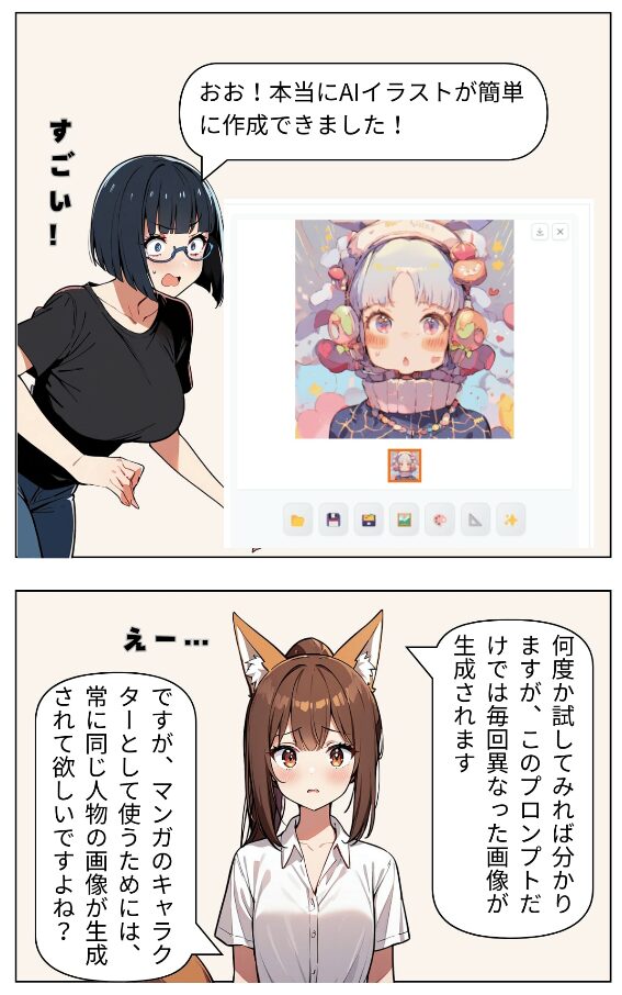 このプロンプトの指定によってどのようなイラストが生成されるかが決まるのですが、マンガに使うためであれば同じキャラクターのイラストが生成されて欲しいと思うはずです。