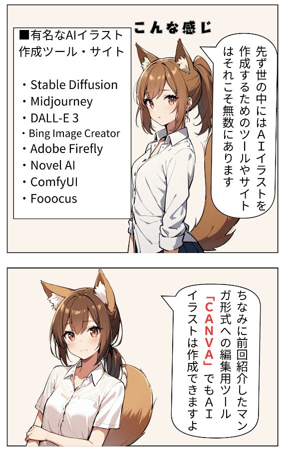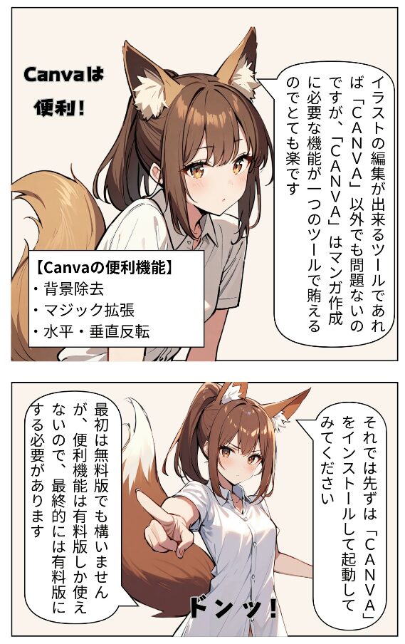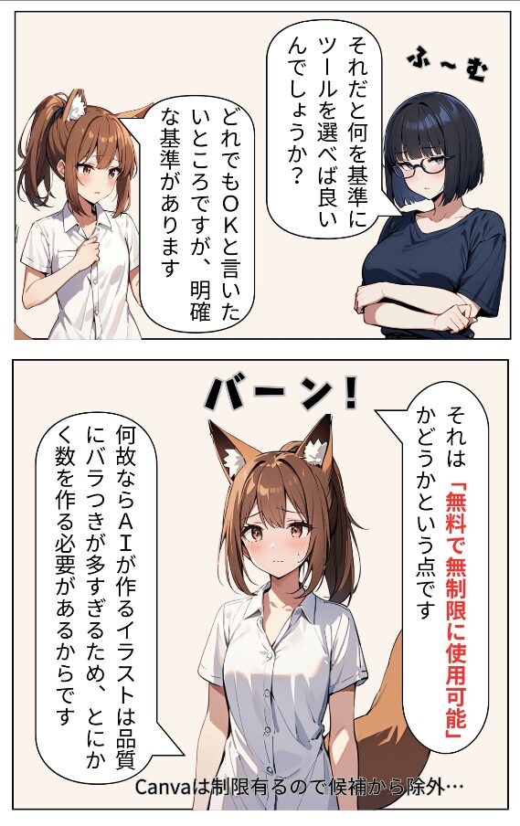 Canvaというツールも本来的にはマンガ制作に向いたツールではありませんが、AIイラストとの相性が非常に良く、やり方さえ理解していれば簡単にマンガが作れるのはとても大きいです。