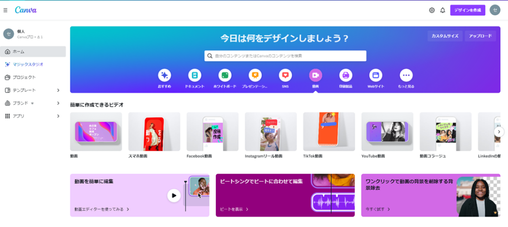 Canvaでは「マジック生成」という機能を利用することで、AI動画を生成出来ます。こちらはCanvaの左側メニューの中から「マジック生成」を選択し、さらにその中で「動画」タブを開くことで生成することが出来ます。