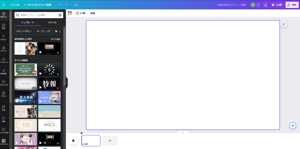 このキャンバス上で動画を編集していくことになります。キャンバスの下部を見ると、これまでの画像の時と違って「5.0秒」と表示されたミニ画面があるのが分かると思います。