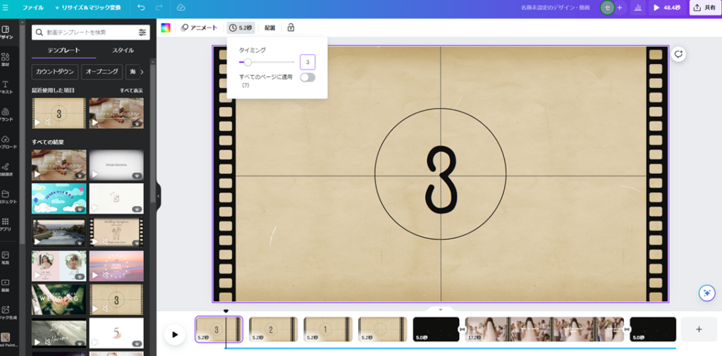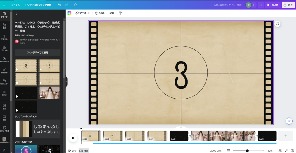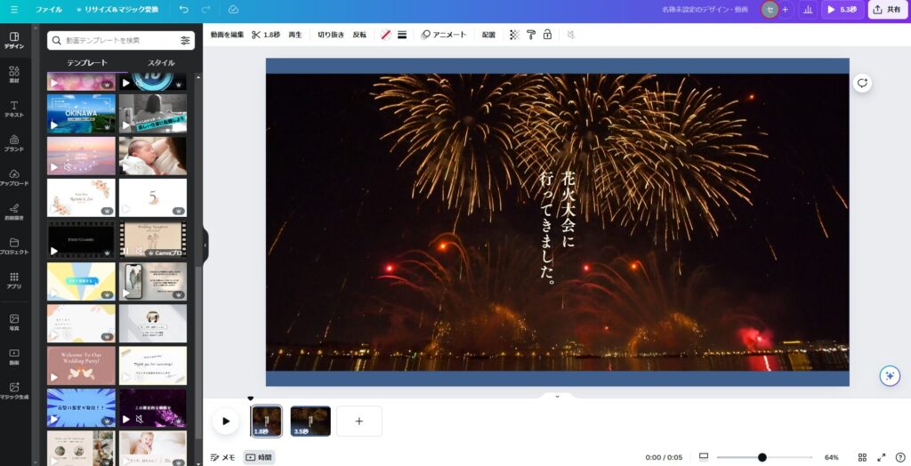 撮影した動画が無ければ、「デザイン」の中からお試し用に好きな動画をクリックしてみてください。