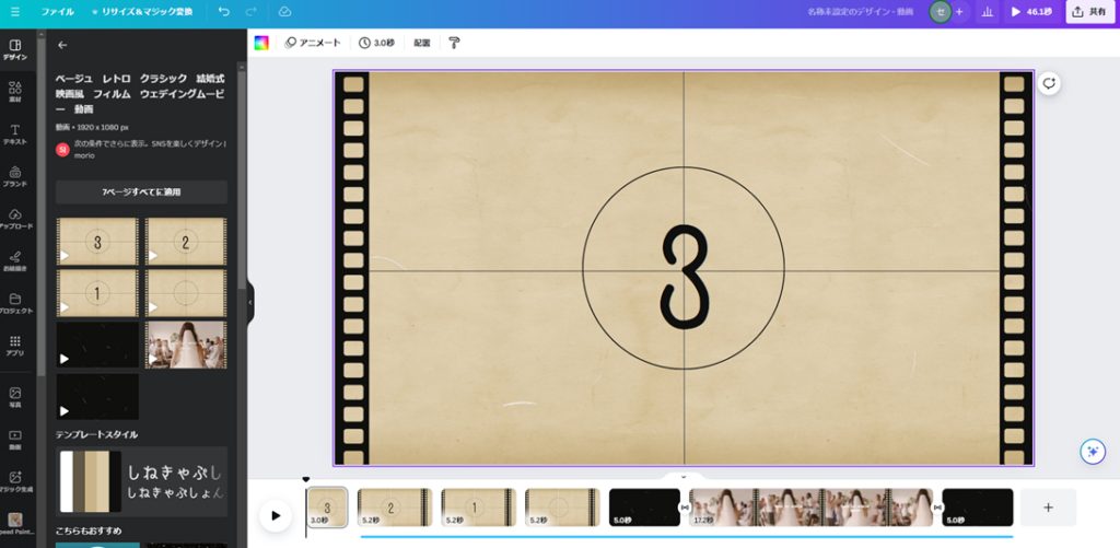 素材の動画を選んだ際にウィンドウの左側に「〇ページすべてに適用」というメッセージが出てくるものと、出てこないものがあります。このメッセージは複数シーンで構成された動画素材の場合に出てくるものです。