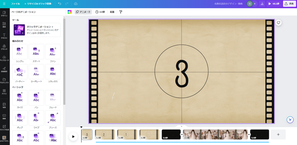 Canvaは使いやすいようにそれぞれのアニメートにマウスを合わせた時点でキャンバス内の動画がどのように変わるかをその場で即表示してくれます。