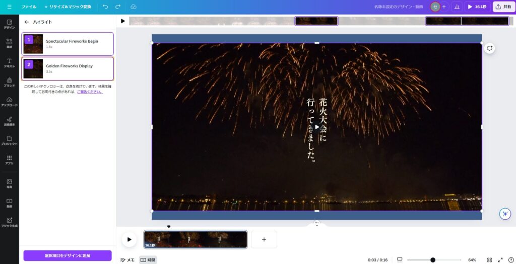 キャンバスの下側の動画シーンの個所がそれぞれのハイライトシーンに置き換わったのが分かりますでしょうか。このようにハイライト機能を使うことで重要なシーンを自動で検出して、そのシーンだけを切り抜いた動画を作成することが出来ました。