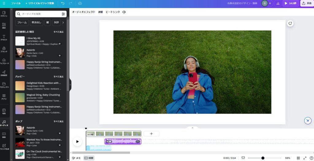 Canvaの動画では「オーディオ」機能を使うことで、動画に音楽を付けることも簡単に出来ます。使い方としてはCanva左側のメニューから「オーディオ」を選択します。