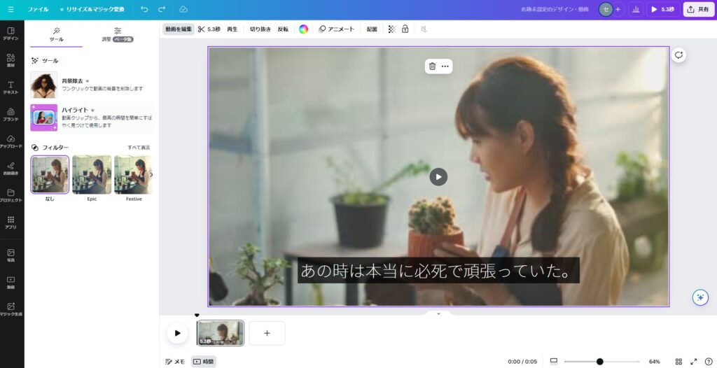 Canvaの動画編集機能には「ハイライト」というAIが自動的に動画の中から重要なシーンを抜き出す機能があります。使い方はキャンバス上の動画を選択した状態で、左上にある「動画を編集」選択して「ハイライト」を選ぶだけです。