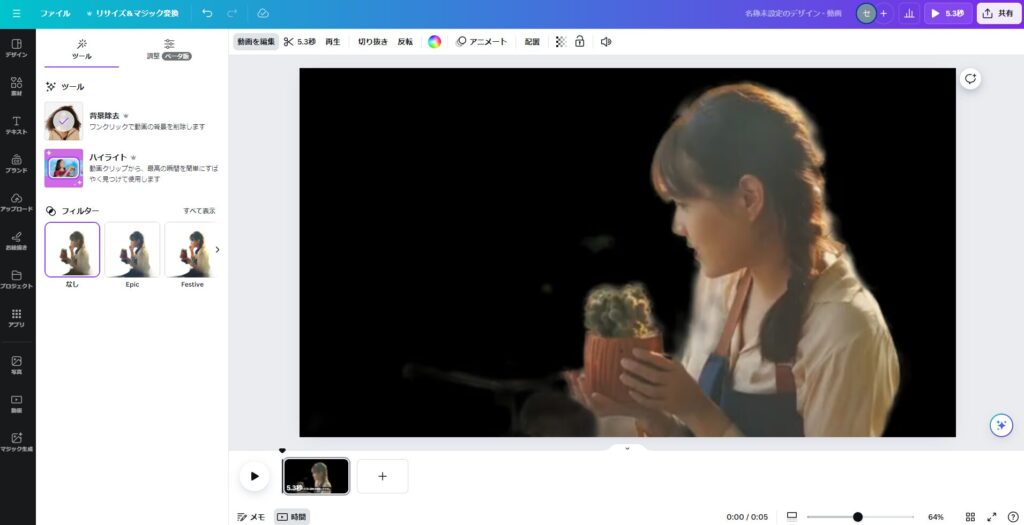 ここで動画を選択した状態にしてからキャンバス上部にある「動画を編集」ボタンを押すことで、左側に「背景除去」が表示されます。